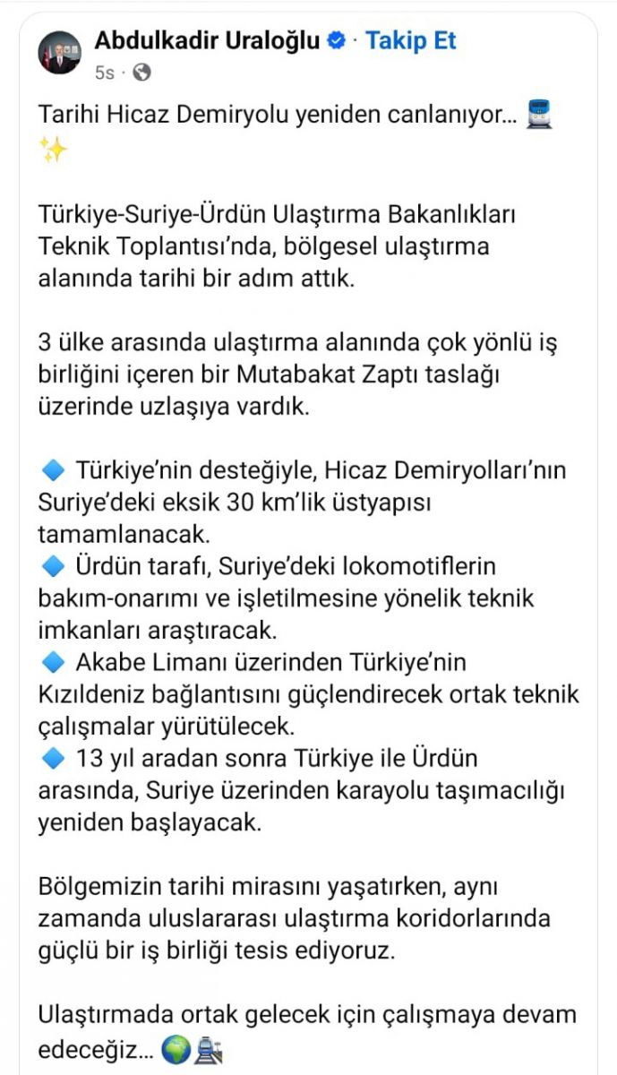 Ulaştırma ve Altyapı Bakanı Abdulkadir Uraloğlu, Sosyal medya hesabında; Tarihi Hicaz Demiryolu'nun yeniden canlandığını duyurarak, "Türkiye-Suriye-Ürdün Ulaştırma Bakanlıkları Teknik Toplantısı’nda, bölgesel ulaştırma alanında tarihi bir adım attık" dedi. Bakan Uraloğlu şunları söyledi: "3 ülke arasında ulaştırma alanında çok yönlü iş birliğini içeren bir Mutabakat Zaptı taslağı üzerinde uzlaşıya vardık. * Türkiye’nin desteğiyle, Hicaz Demiryolları’nın Suriye’deki eksik 30 km’lik üstyapısı tamamlanacak. * Ürdün tarafı, Suriye’deki lokomotiflerin bakım-onarımı ve işletilmesine yönelik teknik imkanları araştıracak. * Akabe Limanı üzerinden Türkiye’nin Kızıldeniz bağlantısını güçlendirecek ortak teknik çalışmalar yürütülecek. * 13 yıl aradan sonra Türkiye ile Ürdün arasında, Suriye üzerinden karayolu taşımacılığı yeniden başlayacak. Bölgemizin tarihi mirasını yaşatırken, aynı zamanda uluslararası ulaştırma koridorlarında güçlü bir iş birliği tesis ediyoruz. Ulaştırmada ortak gelecek için çalışmaya devam edeceğiz” dedi.