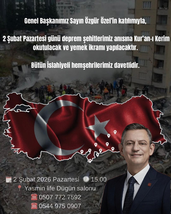 CHP Gaziantep il ve ilçe teşkilatları ile milletvekilleri hazırlıkları başlarken, CHP Genel Başkanı Özel’in 2 Şubat Pazartesi günü İslahiye ziyaretinde deprem şehitleri anısına Kur’an-ı Kerim okutulacağı öğrenildi.