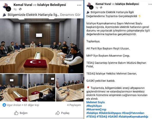 Bu toplantı ile İslâhiye’de vatandaşı canından bezdiren elektirk kesintisi ile birlikte artık bir sorun haline geldiği ve en önemlisi Fevzipaşa dağıtım merkezine ek trafonun konması resmi ağızlardan teyit edilmiş olmasıdır.