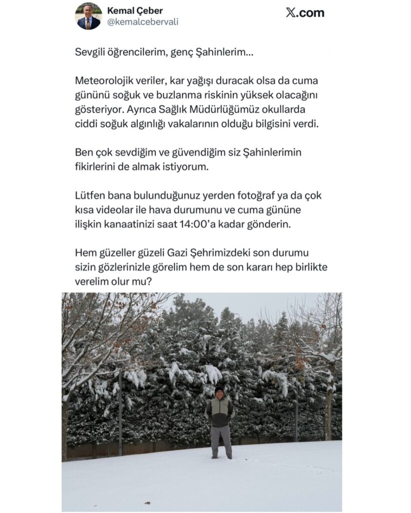 Gaziantep Valiliği sosyal medya hesabında ve basın açıklamasında; Meteorolojik veriler ışığında ilgili birimlerimiz tarafından yapılan değerlendirmeye göre, 2 Ocak 2026 Cuma günü Gaziantep’te hava sıcaklıklarının düşmesi ve buzlanma riski oluşması nedeniyle öğrenci ve eğitimcilerimizin sağlığı ve trafikte yaşanacak olumsuz durumlar göz önünde bulundurularak, İlimiz geneli Milli Eğitim Bakanlığı’na bağlı örgün ve yaygın eğitim veren tüm resmi ve özel eğitim-öğretim kurumları, Aile ve Sosyal Hizmetler Bakanlığı’na bağlı kreş ve gündüz bakımevleri ile Diyanet İşleri Başkanlığı’na bağlı kuran kursları 2 Ocak 2026 Cuma günü bir gün süreyle tatil edilmiştir. Kamu kurumlarımızda çalışan engelli, ağır kronik rahatsızlığı olan ve hamile personelimiz de aynı süre içerisinde bir gün idari izinli sayılacaktır. Kamuoyuna saygıyla duyurulur.