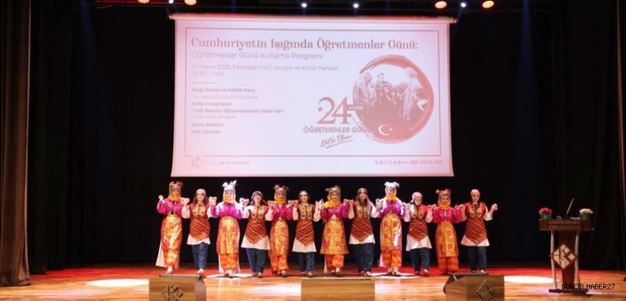Gaziantep Hasan Kalyoncu Üniversitesi'nde (HKÜ) 24 Kasım Öğretmenler Günü kapsamında düzenlenen 'Cumhuriyetin Işığında Öğretmenin Bir Günü' temalı kutlama programı Eğitim Fakültesi koordinatörlüğünde HKÜ Kongre ve Kültür Merkezi'nde saygı duruşu ve Özel Eğitim Topluluğu öğrencilerinin işaret dili ile İstiklal Marşı’nı seslendirmeleriyle başladı. Programa Gaziantep Büyükşehir Belediye Başkanı Fatma Şahin, Kalyon Vakfı Başkanı Reyhan Kalyoncu, HKÜ Rektör Vekili Prof. Dr. Gül Rengin Küçük Erdoğan, Eğitim Fakültesi Dekanı Prof. Dr. Latife Özaydın, eğitim yöneticileri, öğretim üyeleri, öğretmenler ve öğrenciler katıldı.