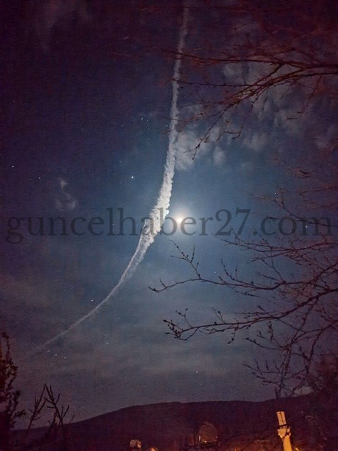 İslahiye semalarında dikkat çekici bir olay yaşandı. 25 Mart 2026 gecesi, saat 22.16 sularında bir uçak, Ağabey Mahallesi üzerinde rotasını değiştirerek yerleşim alanlarının üzerinde bir iz bıraktı. O an gökyüzünde dolunayın bulunması, yaşananların çıplak gözle net bir şekilde görülmesine imkan tanıdı. Olayı fark eder etmez fotoğrafını çekmeyi başardım.