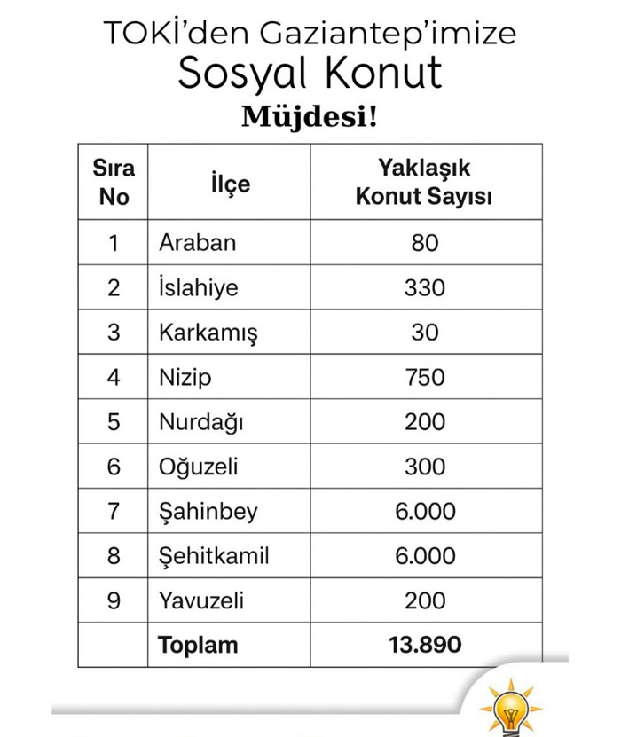 AK Parti İslahiye İlçe Başkanı Reşit Uluşan, dar gelirli vatandaşlar için TOKİ’nin yeni sosyal konut kampanyası kapsamında Gaziantep’e toplam 13 bin 890 konut kazandırılırken bunun 330 konutun İslâhiye’de yapılacağını müjdeledi. İlçe Başkanı Uluşan, Her anlamda tarihin en yüksek yatırımları bölgemizde birer birer yükselirken, TOKİ’nin yeni sosyal konut kampanyası kapsamında ilçemize 330 konut kazandırılıyor. TOKİ konut projesiyle dar gelirli vatandaşların uygun ödeme koşullarıyla ev sahibi olmasını hedefliyor. Gaziantep genelinde büyük bir memnuniyetle karşılanan proje, şehirde konut arzını artırarak hem ekonomik hem de sosyal açıdan önemli katkılar sağlayacaktır. Detayları önümüzdeki günlerde belli olacak sosyal konut projesi için Sayın Cumhurbaşkanımız Recep Tayyip Erdoğan’a, Çevre, Şehircilik ve İklim Bakanımız Murat Kurum’a, Büyükşehir Belediye Başkanımız Fatma Şahin’e, Belediye Başkanı Kemal Vural’a AK Parti Gaziantep Milletvekillerine ve emeği geçen herkese ilçem adına teşekkür ediyor. Tüm hemşerilerimize hayırlı olsun dedi.