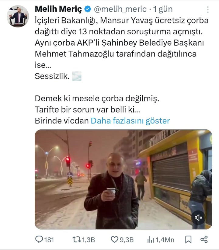 Cumhuriyet Halk Partisi Gaziantep Milletvekili Melih Meriç, İçişleri Bakanlığı, Mansur Yavaş ücretsiz çorba dağıttı diye 13 noktadan soruşturma açmıştı. Aynı çorba AKP’li Şahinbey Belediye Başkanı Mehmet Tahmazoğlu tarafından dağıtılınca ise..Sessizlik.