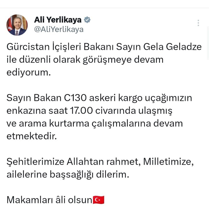 İçişleri Bakanı Ali Yerlikaya, sosyal medya hesabından; “Azerbaycan’dan ülkemize gelmekte olan Milli Savunma Bakanlığımıza ait C130 askeri kargo uçağımızın Gürcistan-Azerbaycan sınırında düştüğünü derin bir üzüntüyle öğrendim. Arama kurtarma çalışmaları devam ediyor.