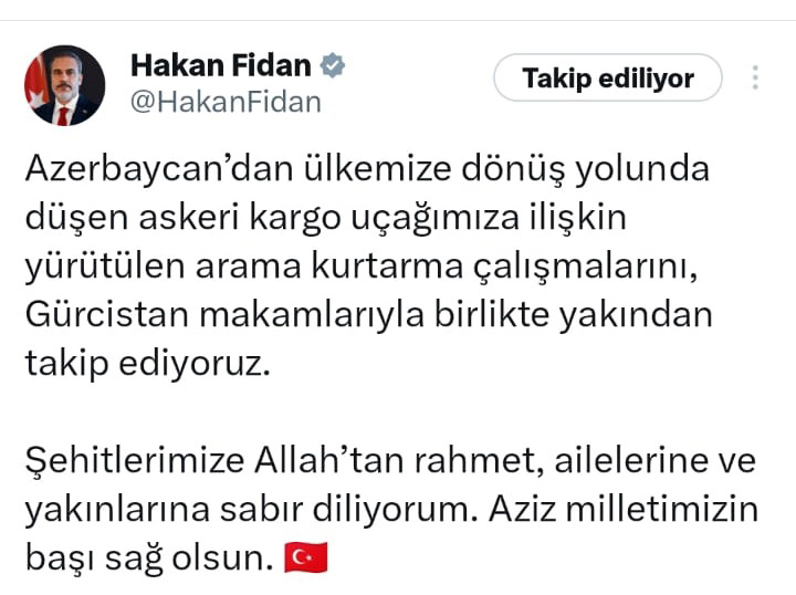 Dışişleri Bakanı Hakan Fidan, sosyal medya hesabındaki açıklamasında, “Azerbaycan’dan ülkemize dönüş yolunda düşen askeri kargo uçağımıza ilişkin yürütülen arama kurtarma çalışmalarını, Gürcistan makamlarıyla birlikte yakından takip ediyoruz. Şehitlerimize Allah’tan rahmet, ailelerine ve yakınlarına sabır diliyorum. Aziz milletimizin başı sağ olsun” ifadelerini kullandı.