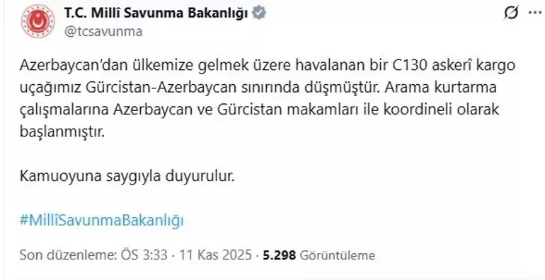 Milli Savunma Bakanlığından yapılan açıklamada, “Azerbaycan’dan ülkemize gelmek üzere havalanan bir C130 askeri kargo uçağımız Gürcistan-Azerbaycan sınırında düşmüştür. Arama kurtarma çalışmalarına Azerbaycan ve Gürcistan makamları ile koordineli olarak başlanmıştır” denildi.
