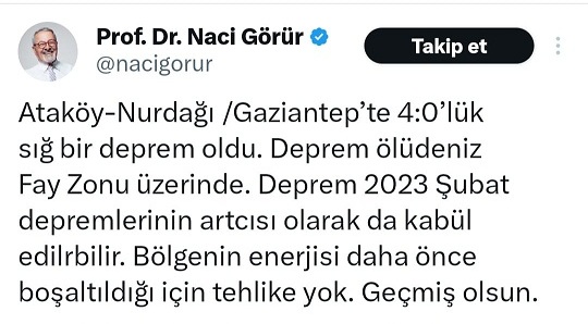 Görür, şunları kaydetti: “Ataköy-Nurdağı /Gaziantep’te 4.0 ’lük sığ bir deprem oldu. Deprem ölüdeniz Fay Zonu üzerinde. Deprem 2023 Şubat depremlerinin artçısı olarak da kabul edilebilir. Bölgenin enerjisi daha önce boşaltıldığı için tehlike yok. Geçmiş olsun.”