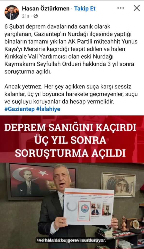 Cumhuriyet Halk Partisi Gaziantep Milletvekili Hasan Öztürkmen, Kahramanmaraş merkezli depremlerde Gaziantep’in Nurdağı ilçesinde yaptığı binaların tamamı yıkılan AK Partili Belediye meclis üyesi Yunus Kaya’yı Mersin’e kaçıran Dönemin Kaymakamı Seyfullah Ordueri hakkında 3 yıl sonra soruşturma açıldı.