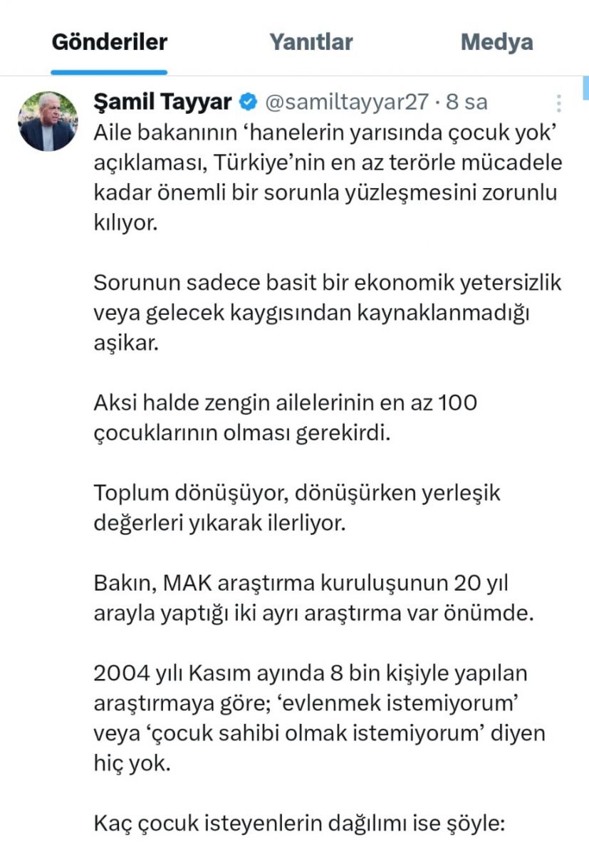 AK Parti Gaziantep Milletvekili Şamil Tayyar, sosyal medya hesabında; Aile bakanının ‘hanelerin yarısında çocuk yok’ açıklaması, Türkiye’nin en az terörle mücadele kadar önemli bir sorunla yüzleşmesini zorunlu kılıyor. Sorunun sadece basit bir ekonomik yetersizlik veya gelecek kaygısından kaynaklanmadığı aşikâr. Aksi halde zengin ailelerinin en az 100 çocuklarının olması gerekirdi. Toplum dönüşüyor, dönüşürken yerleşik değerleri yıkarak ilerliyor. Bakın, MAK araştırma kuruluşunun 20 yıl arayla yaptığı iki ayrı araştırma var önümde.2004 yılı Kasım ayında 8 bin kişiyle yapılan araştırmaya göre; ‘evlenmek istemiyorum’ veya ‘çocuk sahibi olmak istemiyorum’ diyen hiç yok.