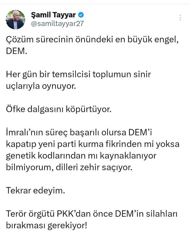 AK Parti Gaziantep eski Milletvekili Şamil Tayyar, sosyal medya hesabında, Çözüm sürecinin önündeki en büyük engel, DEM. Her gün bir temsilcisi toplumun sinir uçlarıyla oynuyor.