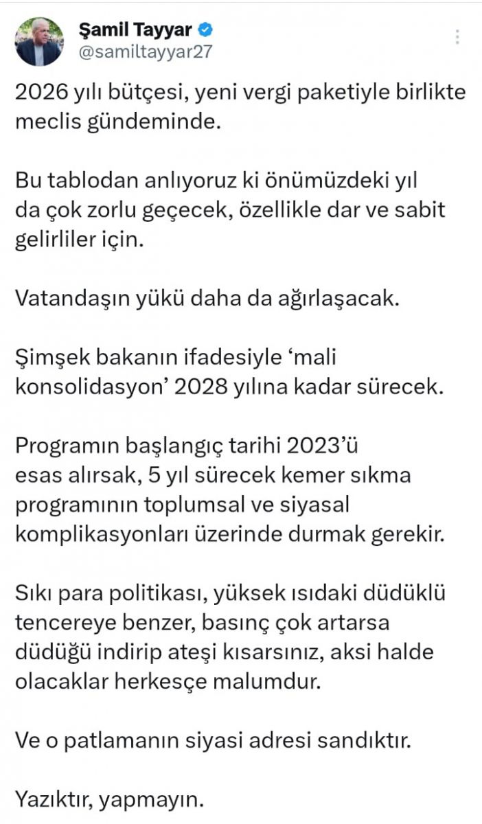 AK Parti Gaziantep eski Milletvekili Şamil Tayyar, sosyal medya hesabından yaptığı açıklamada; 2026 yılı bütçesi, yeni vergi paketiyle birlikte meclis gündeminde.