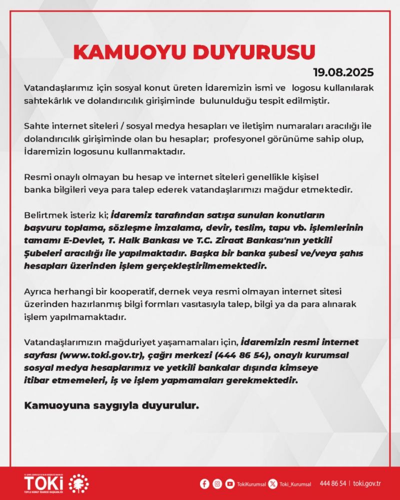 TOKİ’den yapılan duyuruda, sahte internet siteleri ve sosyal medya hesaplarının profesyonel bir görünüme sahip olmasına rağmen resmi kurumla hiçbir bağlantısının bulunmadığı vurgulandı. Bu hesapların vatandaşlardan kişisel banka bilgileri ya da para talep ederek mağduriyetlere yol açtığı belirtildi.